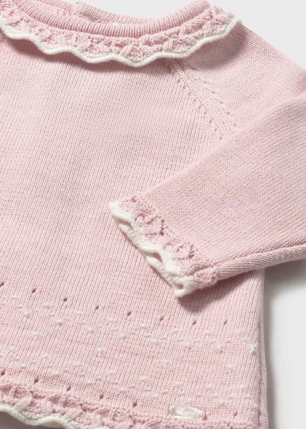 Suéter de manga larga para recién nacida. Cuello redondo con detalles al tono. Cierre con botones en la espalda para facilitar la puesta de la prenda.