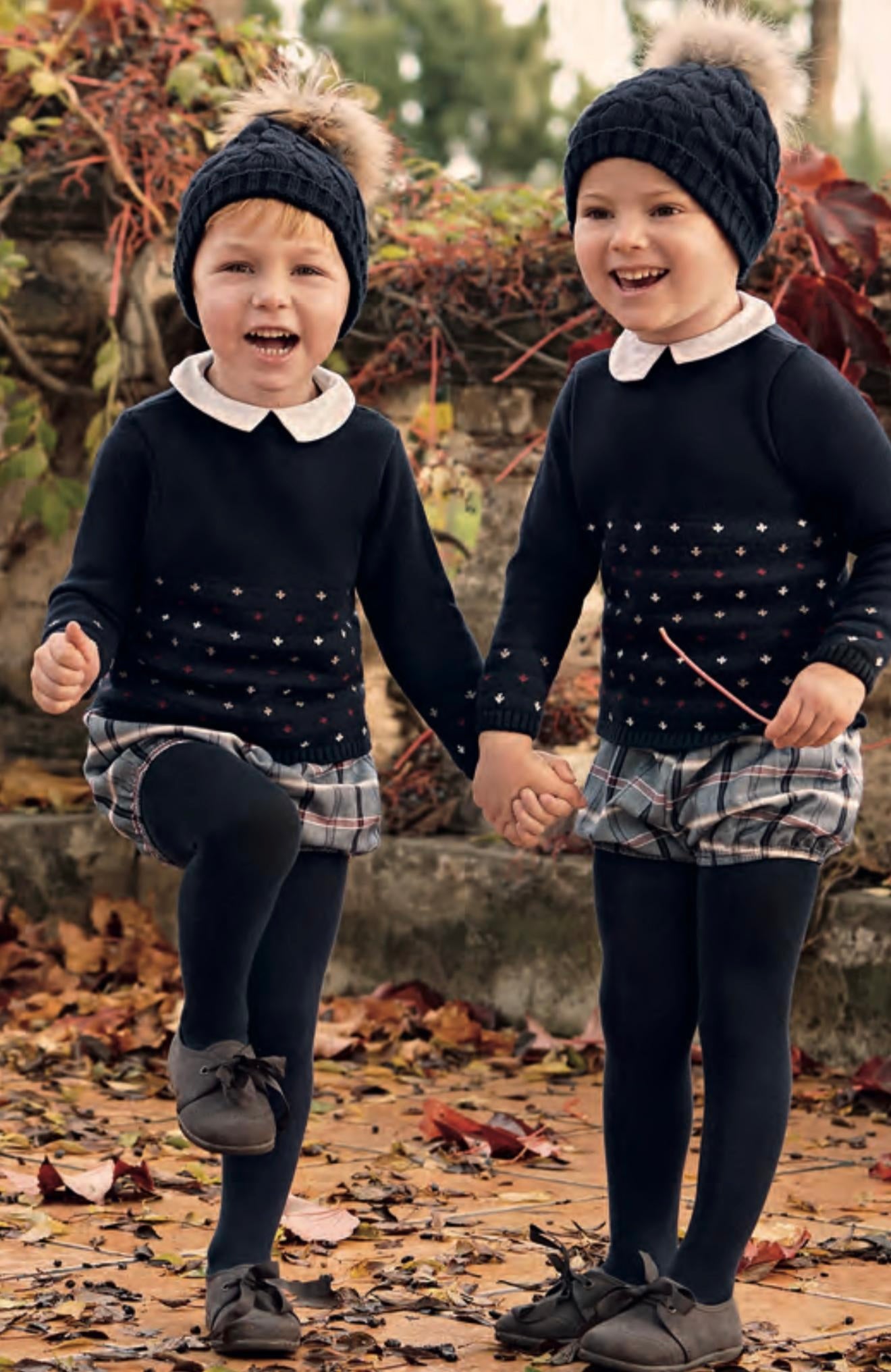 Conjunto de la marca española juliana de dos piezas para niño con suéter azul marino y estrellas de colores y pantalón corto gris a rayas