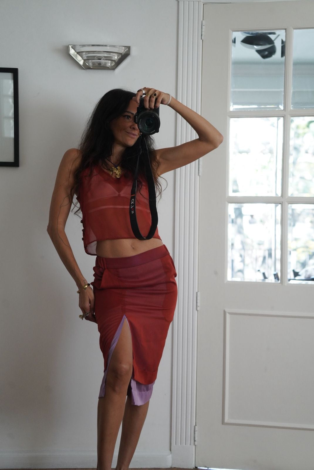 Falda corte midi y a la cintura, confeccionada en shiffon que se mueve con ligereza y fluidez.