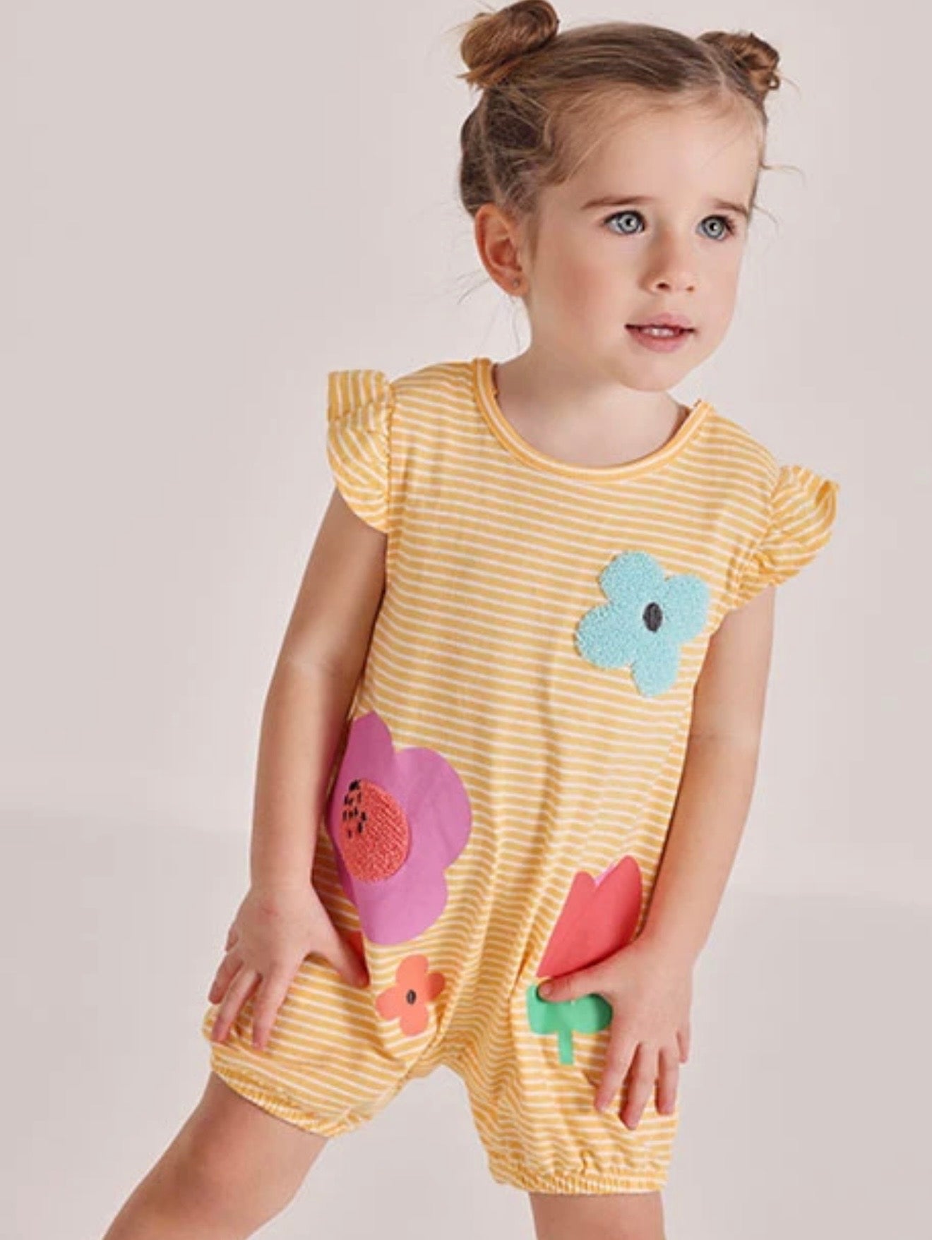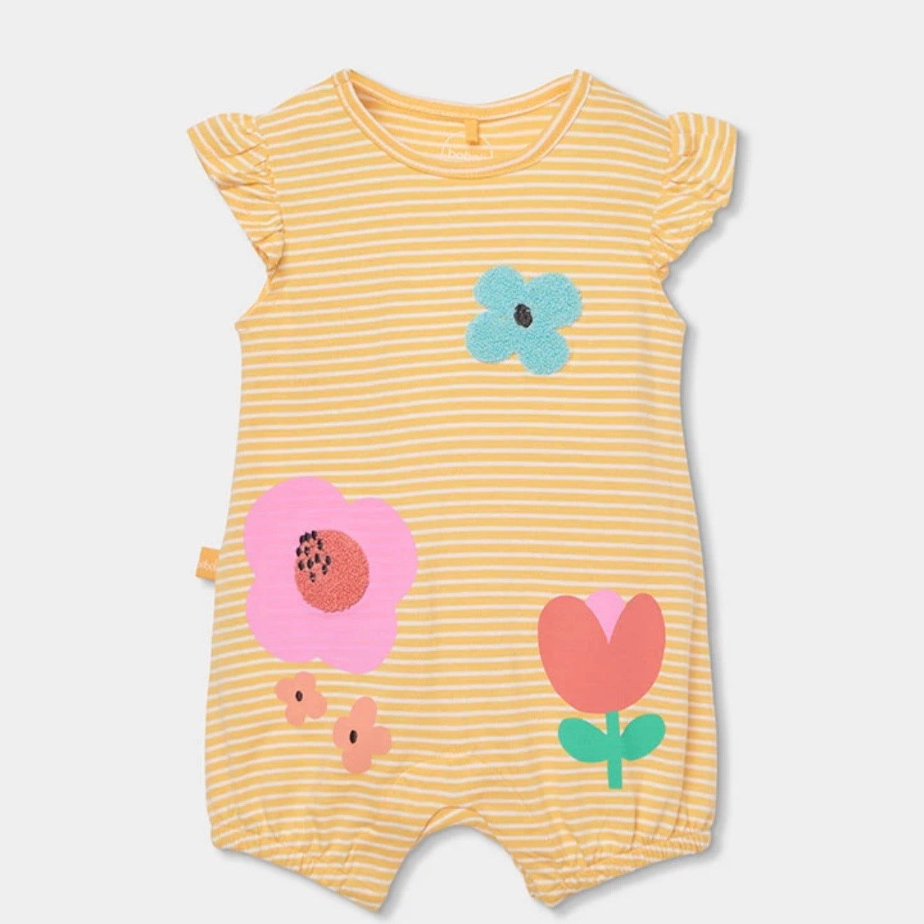 Pelele de punto de algodón para bebé, ideal para recién nacidos, con un diseño listado en color amarillo y blanco con dibujos de flores en colores vibrantes que añaden un toque alegre y divertido. La prenda tiene un cuello redondo y mangas cortas de volantes. Está disponible en tallas desde 0 meses hasta los 24 meses, adaptándose perfectamente al crecimiento del bebé. Su material suave y ligero lo hace perfecto para mantener la comodidad durante todo el día.