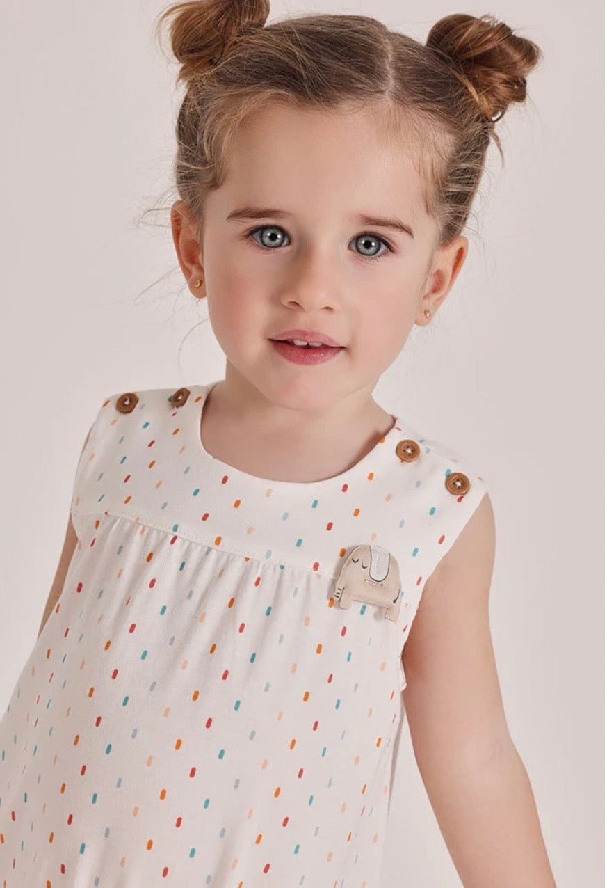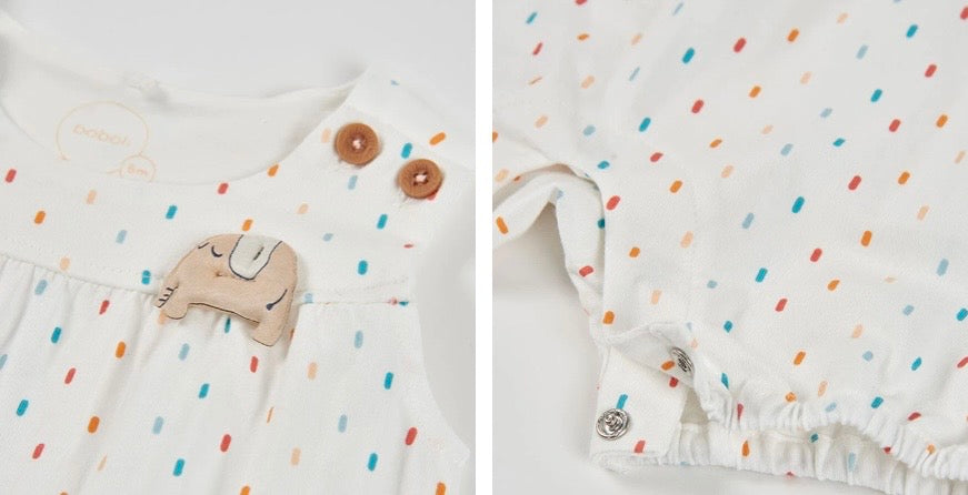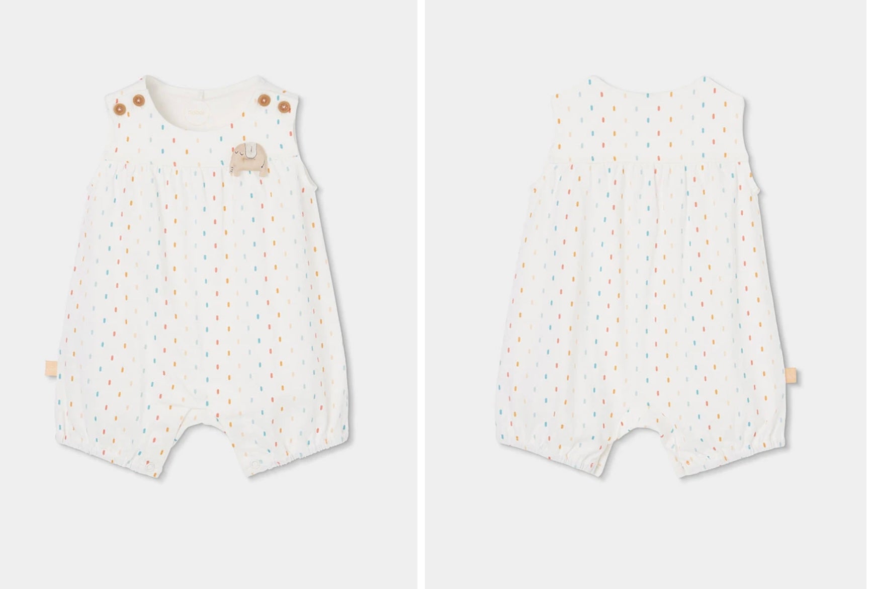 Pelele de algodón blanco , con motas tejidas en diferentes colores, para bebé.Su diseño sin mangas y botones en los hombros facilitan su uso. Este pelele es una opción práctica y encantadora para mantener a tu bebé cómodo y a la moda.