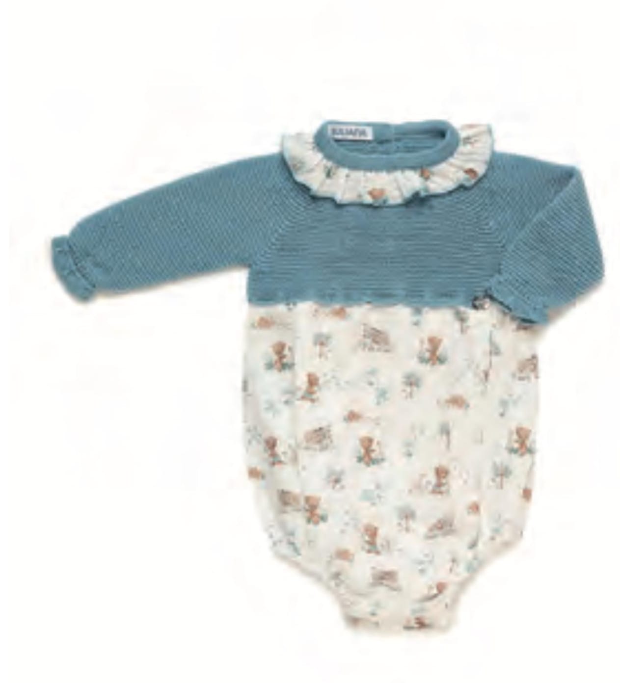 Hermoso pelele con tejido de punto color turquesa,tela de algodón de lino estampado de animalitos de nuestra marca española juliana