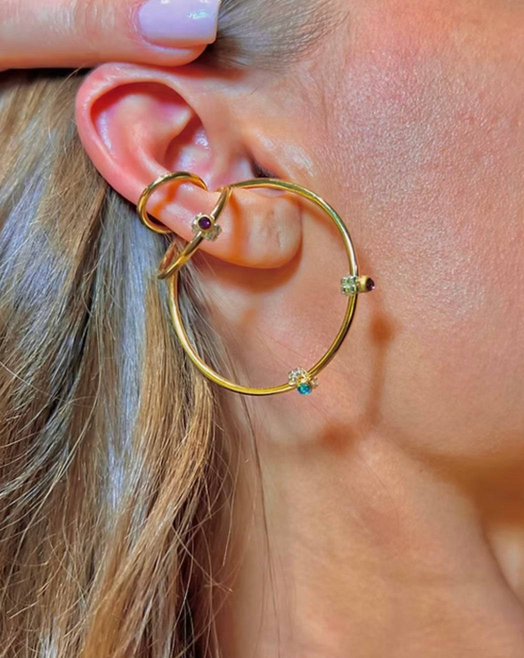 Arete una pieza Cristal japones en tono plateado, cristal swarovski morado y verde, terminaciones chapadas en oro de 18 k
