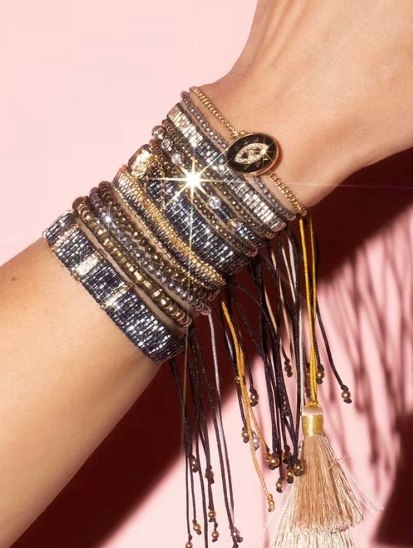 12 piezas (cristal japones en tonos gris oxford, plateado, dorado y nude, cristal swarovsky, hematita, con terminaciones metalicas chapadas en oro de 18k)