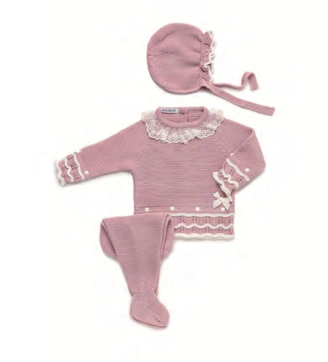 Hermoso conjunto de tres piezas de nuestra marcada española Juliana, con tejido artesanal de algodón color palo de Rosa