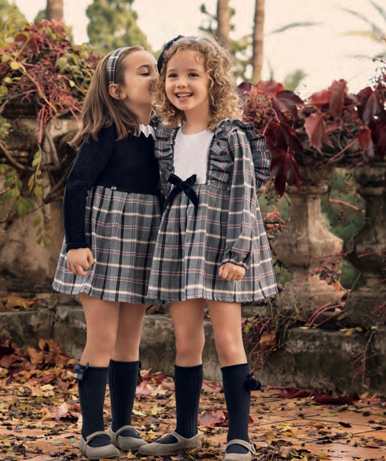 Hermoso vestido de nuestra marca española Juliana corte A con moño azul marino de terciopelo, te la a cuadros grises azules y rojos con planes laterales