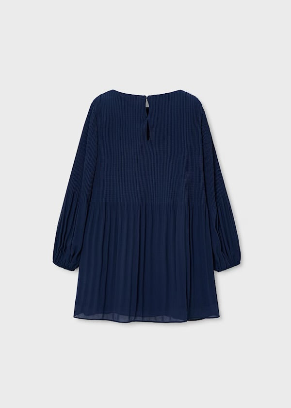 Vestido de manga larga para niña con puños elásticos. Pequeña abertura en la espalda con cierre de botón para facilitar la puesta de la prenda. Fluido tejido de gasa de gran ligereza. Suave forro interior de poliéster. Modelo con diseño plisado.