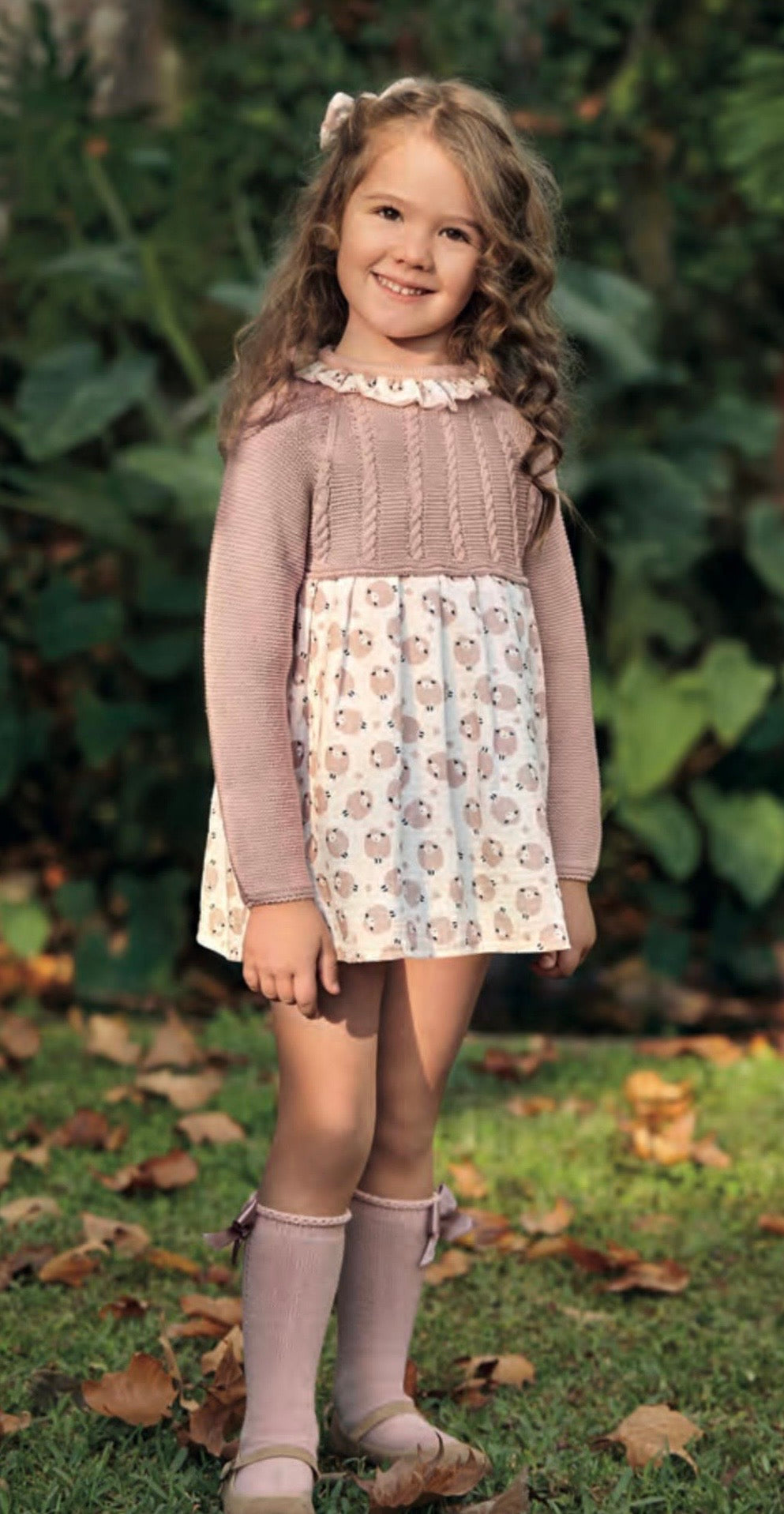 Hermoso vestido de punto trenzado con tela de lino de algodón diseño de ovejas , color palo de rosa de nuestra marca española juliana