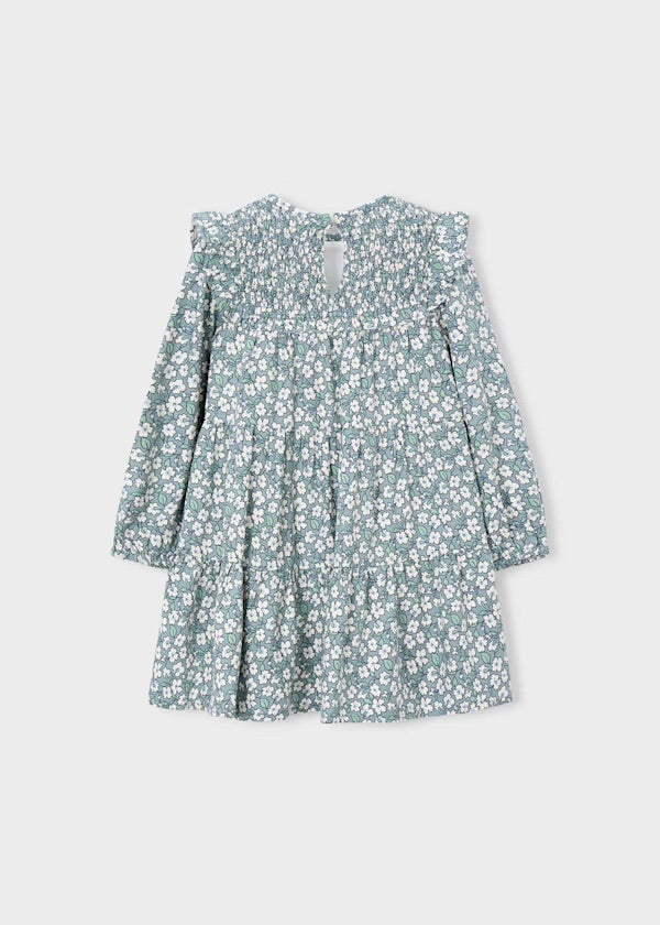Vestido mayoral de manga larga para niña con holanes en los hombros. Cuello redondo. Cierre con un único botón. Tejido cálido ideal para los días más fríos. Este modelo lleva detalles de nido de abeja. Modelo con rizo. Diseño estampado.